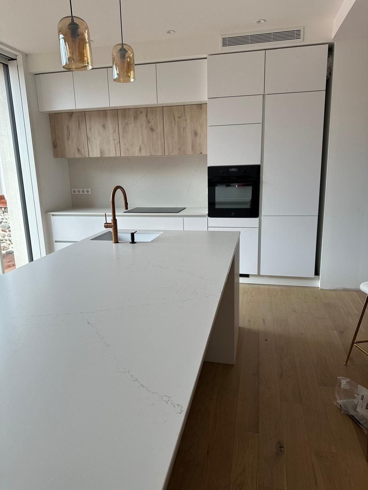 Réalisation sur mesure d’un cuisine hors norme avec énormissime îlot central avec évier sous plan et décaissé égouttoir dans la masse en Iconic White de la gamme Silestone en retombées en jambages. Création de plans de travail en Silestone sur mesure par notre société. Le Silestone est un composite fabriqué avec un minimum de 94% de quartz naturel, ce qui rend la surface très résistante et dure. C’est le seul et unique plan de travail en quartz avec protection bactériostatique, ce qui lui donne des propriétés d’hygiène inégalables sur le marché. Résistant aux taches Silestone est une surface non poreuse, résistante aux taches de café, jus de citron, huile olive, vinaigre et tout autre produit quotidien Résistant aux acides Le quartz est l’un des matériaux les plus durs au monde. C’est donc la composition même du Silestone qui rend notre produit durable avec une très forte résistance aux agressions extérieures. Résistant aux rayures Le quartz est l’un des matériaux les plus durs au monde. C’est donc la composition même du Silestone qui rend notre produit durable avec une très forte résistance aux agressions extérieures. Résistant aux impacts La résistance aux impacts de Silestone est bien plus grande que celle des autres matériaux tels que granits, marbres et autres solides surfaces. Cette résistance s’obtient d’une part, grâce à sa composition en quartz (dureté) et résine de polyester (élasticité) et d’autre part grâce au système de vibrocompression utilisé lors de sa fabrication. Marbrerie Barthe - 31430 Gratens - www.barthe.fr - contact@barthe.fr - Tél: 0561985101 - #iconicwhite #silestoneiconicwhite #silestone #cosentino #cosentinodesign #plandetravail #plansdetravail #plansdetravailsurmesure #plandetravailsurmesure #marbrerie #marbreriebarthe #barthesa31 #barthe #barthesa #plandetravailcuisine #plandetravailsilestone #plandetravailiconicwhite #plandetravailquartzblanc #plandetravailsilestoneblanc #plandetravailcuisineblanc #marbrerie31 #marbrerietoulouse #ilotcentral #ilotcentralcuisine #ilotblanc #architectedinterieur #architecteinterieur #decorateurinterieur #silestonequartz #silestonebycosentinoButton