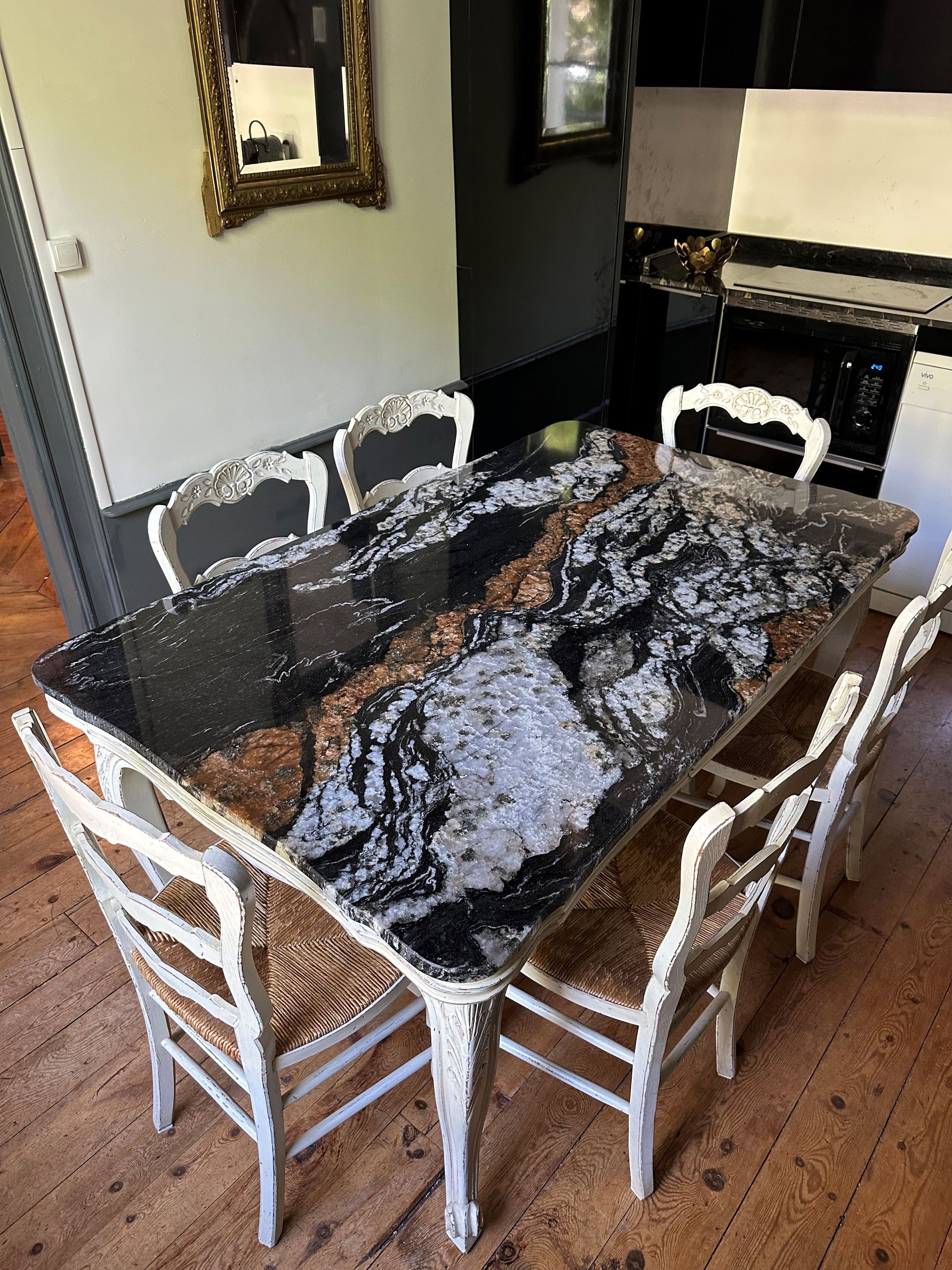Découpe au jet d’eau pour productions de tables pour un restaurant avec le granit Orinoco Sensa de Cosentino. Les veines cuivrées, blanches et dorées de ce granite de style sauvage ondulent sur un fond intense. Relevé de côté et posé par nos équipes. Marbrerie Barthe - 31430 Gratens - www.barthe.fr - contact@barthe.fr - Tél: 0561985101 - #orinoco #sensa #sensaorinoco #cosentino #cosentinodesign #plandetravail #granit #granitorinoco #architectedinterieur #marbrerie #marbreriebarthe #barthesa31 #barthe #architecteinterieur #agenceurdinterieur #agenceur #decorateurinterieur #marbrerie31 #marbrier #marbrier31 #marbriersfaçonniersdefrance #plateaudetable #tabledebistrot #tablesbistrot #plateaudetablemarbre #tablegranit #pietementtableButton